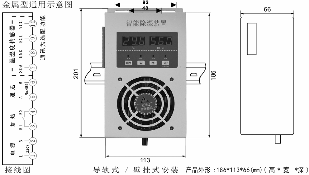 產(chǎn)品簡介 / Introduction概述:智能型除濕裝置是采用半導(dǎo)體制冷除濕方式,主動(dòng)將密閉空間的潮濕空氣在風(fēng)扇的作用下吸入除濕風(fēng)道,空氣中的水汽經(jīng)過半導(dǎo)體制冷機(jī)構(gòu)后冷凝成水,再通過導(dǎo)水管排除柜體,可以達(dá)到很好的除濕效果。降溫型:當(dāng)F01設(shè)置0時(shí)為降溫型,當(dāng)環(huán)境濕度高于濕度最大值(濕度設(shè)定值)期間除濕裝置會(huì)自動(dòng)開啟除濕;當(dāng)環(huán)境濕度低于濕度最低值(濕度設(shè)定值減去濕度回差值)停止除濕。當(dāng)環(huán)境溫度高于設(shè)定溫度最高值(溫度設(shè)定值),風(fēng)扇散熱開始啟動(dòng),當(dāng)溫度低于設(shè)定溫度值(溫度設(shè)定值減去溫度回差值)降溫風(fēng)扇停止工作。升溫型:當(dāng)F01設(shè)置1時(shí)為升溫型,當(dāng)環(huán)境溫度低于設(shè)定溫度最低值(溫度設(shè)定值),加溫開始啟動(dòng),當(dāng)溫度高于最高溫度值(溫度設(shè)定值加上溫度回差值)加溫停止。如同時(shí)需冷凝除濕,設(shè)置濕度值,當(dāng)環(huán)境濕度高于設(shè)定濕度最大值(濕度設(shè)定值)期間除濕裝置會(huì)全自動(dòng)開啟除濕;當(dāng)環(huán)境濕度低于濕度最低值(濕度設(shè)定值減去濕度回差值)停止除濕;當(dāng)手動(dòng)開啟除濕功能時(shí),除濕裝置將一直保持除濕功能,直至手動(dòng)關(guān)閉除濕功能。防結(jié)霜結(jié)冰功能:實(shí)時(shí)監(jiān)測冷凝面工作面溫度,防止冷凝面溫度過低在除濕工作的時(shí)候結(jié)冰結(jié)霜,影響排水效果空氣循環(huán)功能:柜內(nèi)空氣靜止?fàn)顟B(tài)下各個(gè)部位的溫度不同濕度不同,除濕器提供柜內(nèi)空氣循環(huán)功能,使柜內(nèi)各個(gè)方位的溫度濕度更加平均,能更加有效的監(jiān)測柜內(nèi)空氣中的濕度和環(huán)境溫度。技術(shù)參數(shù):